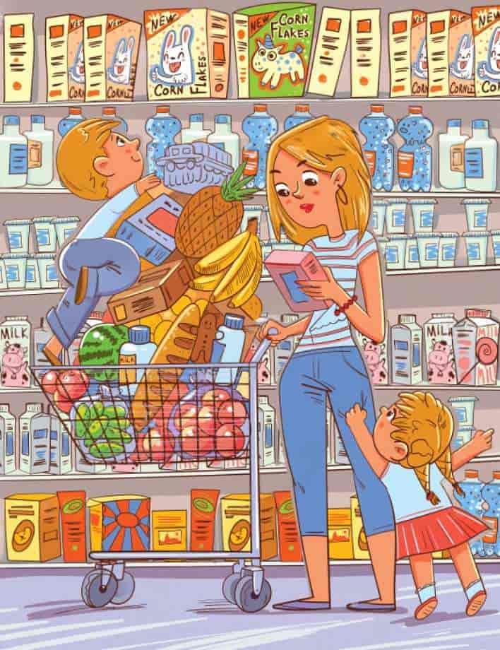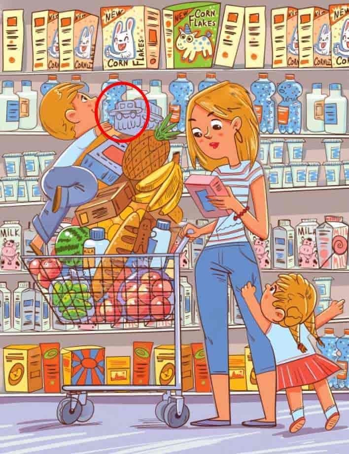 Tato hádanka představuje scénu v supermarketu. Maminka a její dvě děti nakupují v supermarketu potraviny. Na obrázku je vidět auto. Dokážete ho najít do 5 sekund?