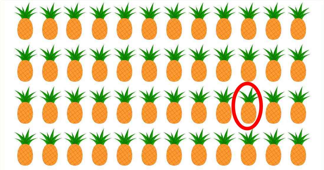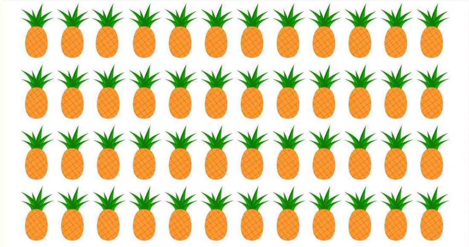 Zkuste vyřešit velmi záludný optický klam – na první pohled jsou všechny ananasy stejné a bude obtížné najít jeden, který se od ostatních liší.
