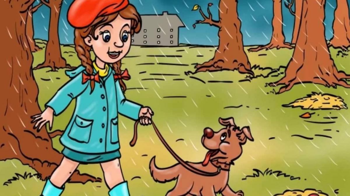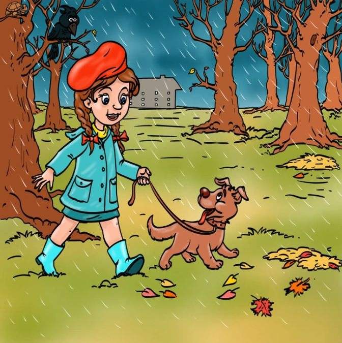 Na obrázku je dívka a její pes na procházce v parku. Soudě podle toho, že na stromech není žádné listí, je hluboký podzim. Prší. Ze stromu se na ně dívá vrána. Naším úkolem je najít mezi všemi želvu.